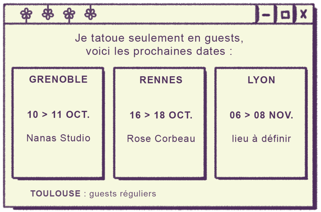 04. OÙ EST TU BASÉE ? Je vis à la campagne proche de Grenoble. Actuellement je tatoue exclusivement en guests dans des shops de différentes villes : Toulouse, Paris, Lyon… Je m’adapte en fonction de la demande donc n’hésite pas à m’envoyer un formulaire en précisant ta ville pour que je puisse prévoir de venir